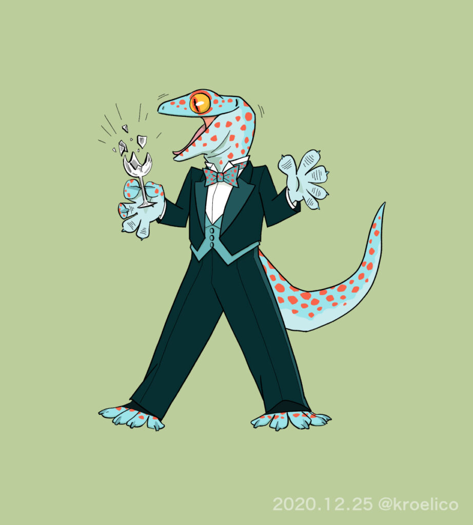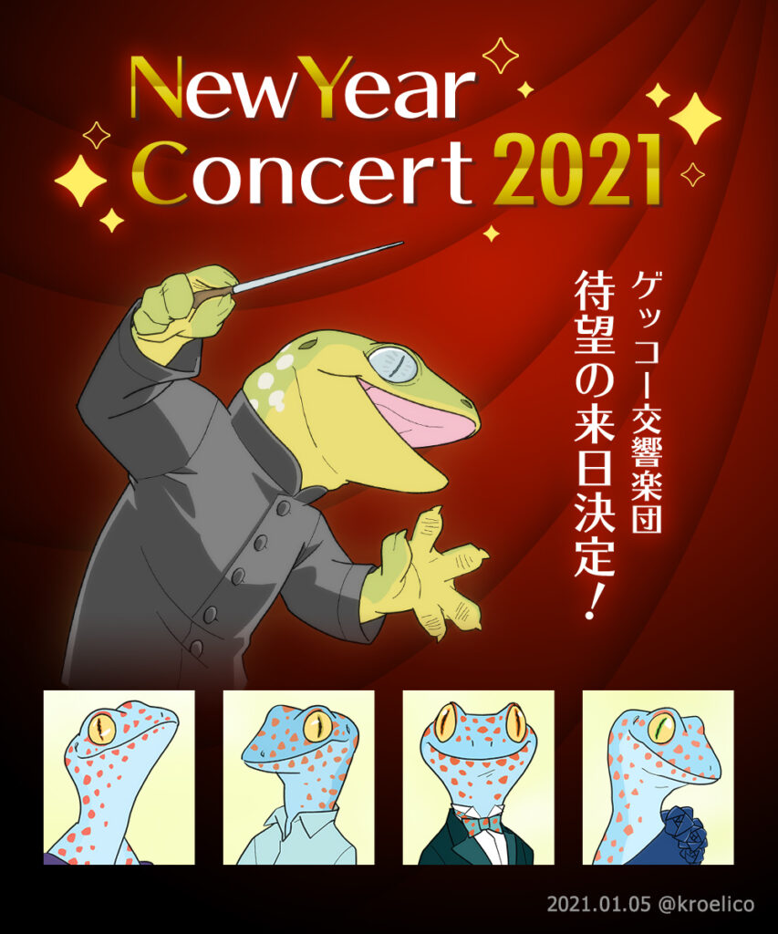 ゲッコー交響楽団 イラスト 2023.09.26 年末のニューイヤーコンサートはゲッコー交響楽団で決まり!指揮のジャイアントゲッコー氏の窮屈そうな首元がチャームポイントです。 トッケイは声がすごく大きいという話を聞きまして。